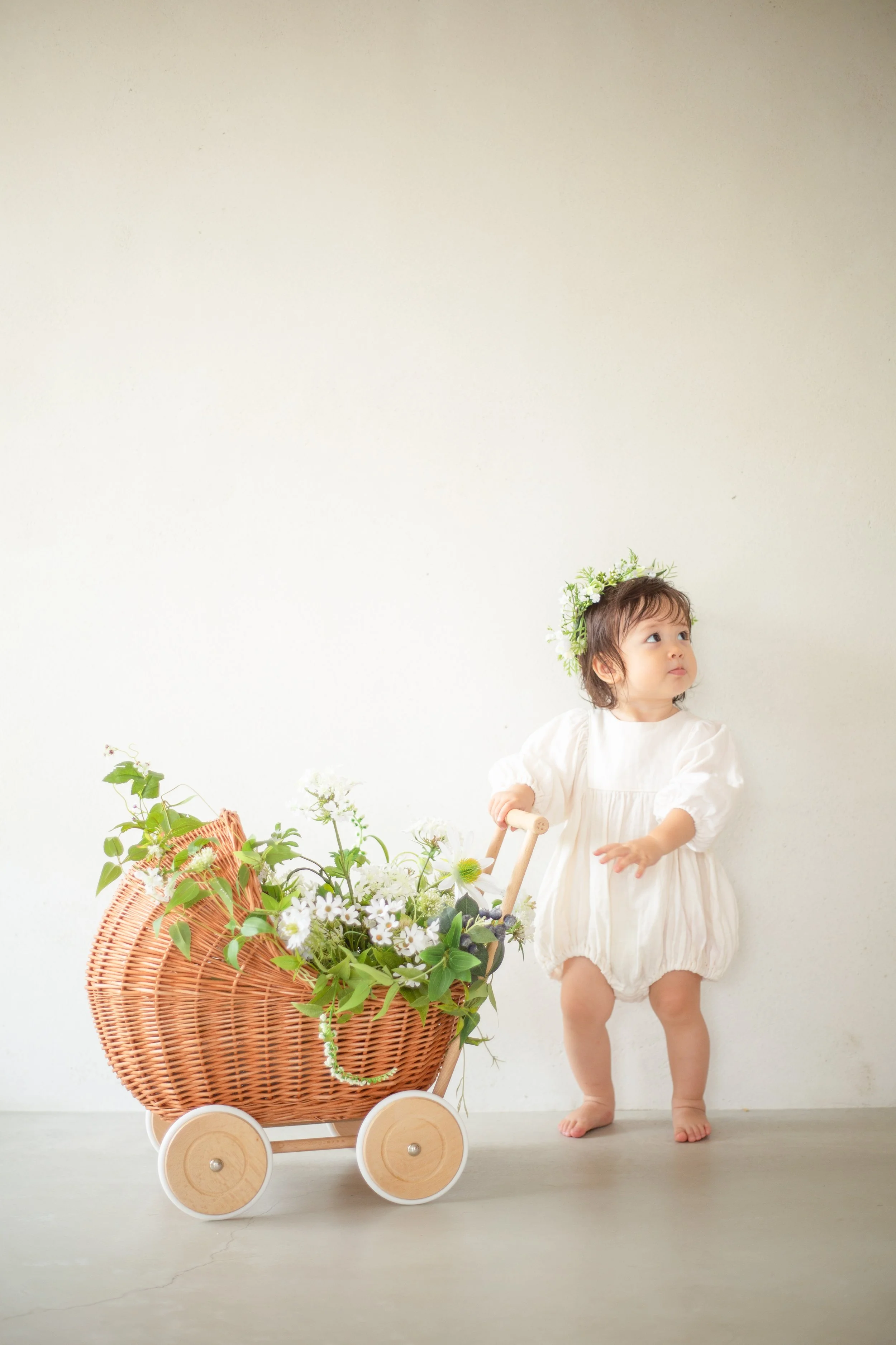 ラタンのバギーに、野原で摘んできたようなアーティフィシャルフラワーがそよそよと。バギーの高さも低く、歩き始めのお子様にもぴったり。⚫︎フラワーカーテン